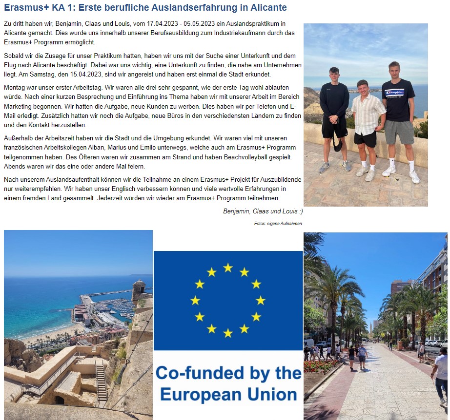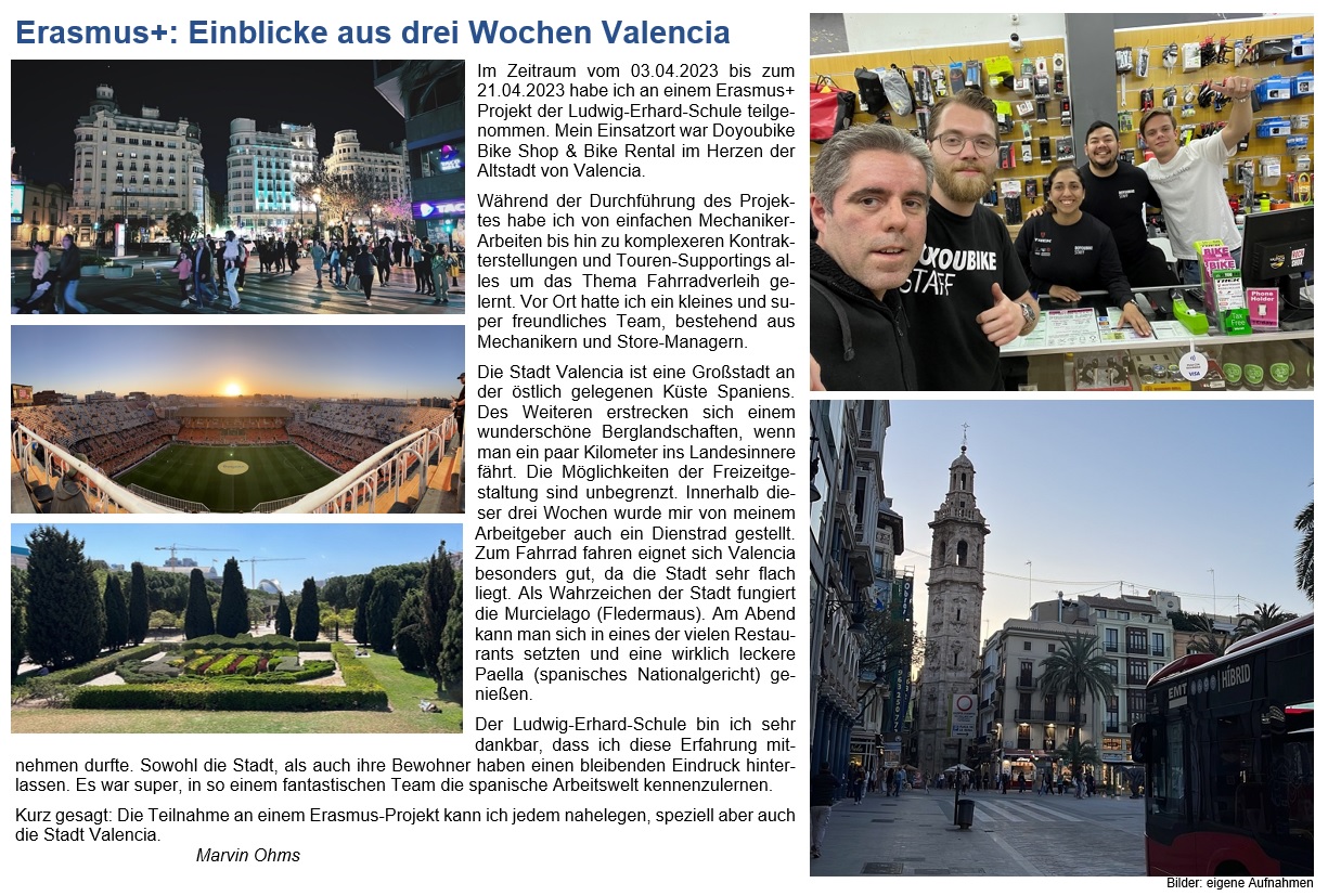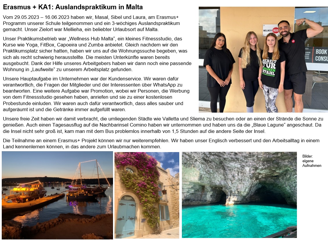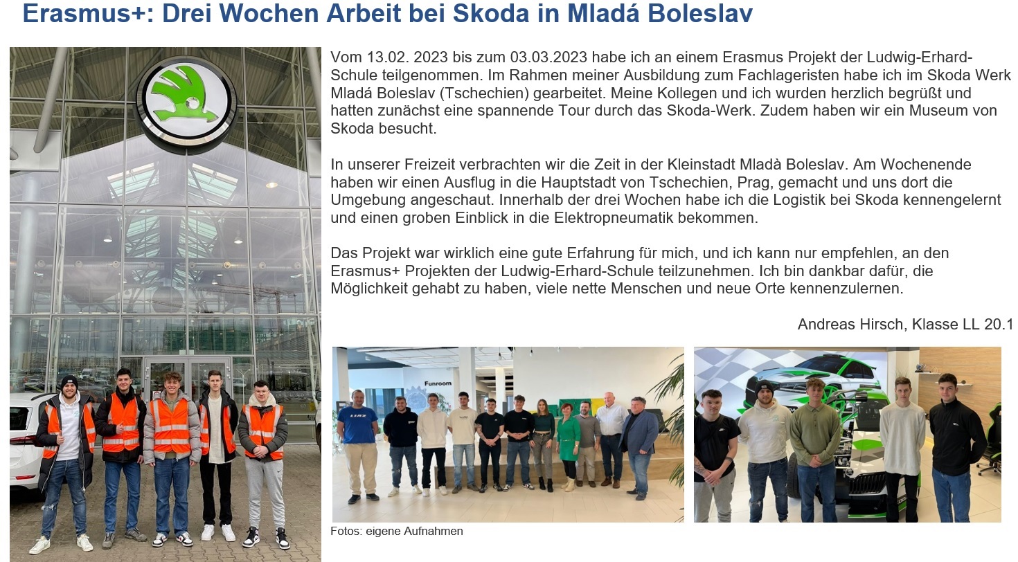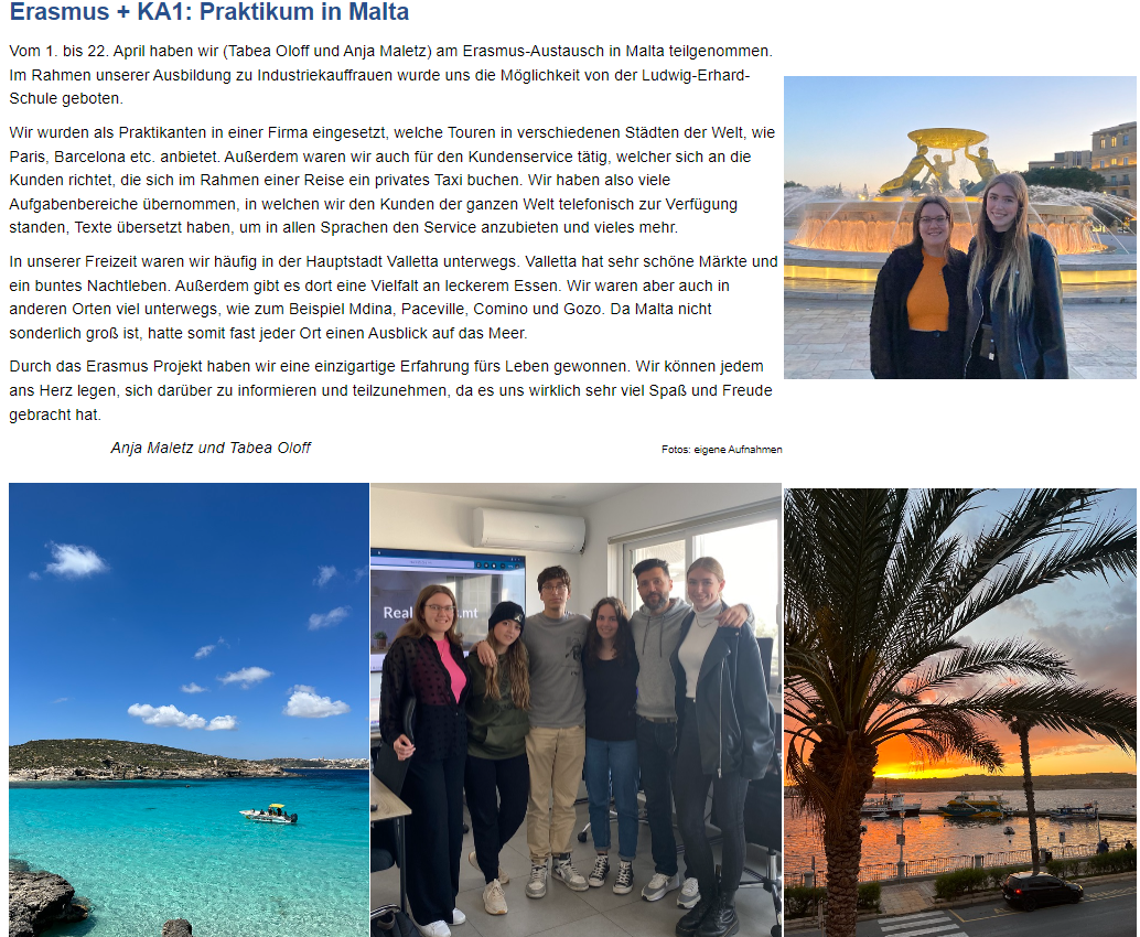 Im Schuljahr 2019/20 wird an der Ludwig-Erhard-Schule erstmalig ein Erasmus+ Projekt im Teilzeitbereich durchgeführt. Dreizehn Schülerinnen und Schüler der dualen Ausbildung haben im Oktober ein dreiwöchiges Praktikum in Polen, Spanien, Malta und der Slowakei absolviert. Sie konnten in den ausländischen Unternehmen den Arbeitsalltag kennenlernen und dabei sowohl ihre fachlichen als auch ihre interkulturellen und sprachlichen Kompetenzen erweitern.